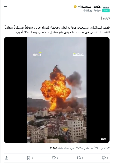 الفيديو المتداول يعود إلى الغارات الإسرائيلية على صنعاء في أغسطس الماضي وليس حديثًا
