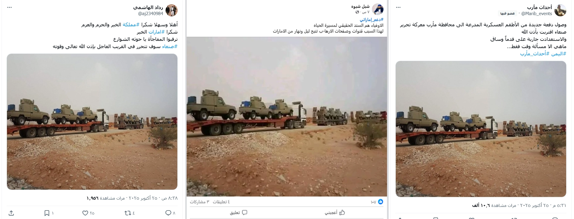 تداولت حسابات على منصات التواصل الاجتماعي صورة زُعم أنها لوصول دعم إلى قوات حلف حضرموت مقدَّم من التحالف العربي، وتداولت حسابات أخرى أنها قُدِّمت لمحافظة مأرب، وكذلك تحشيد على الحدود فما حقيقة الصورة المتداولة؟