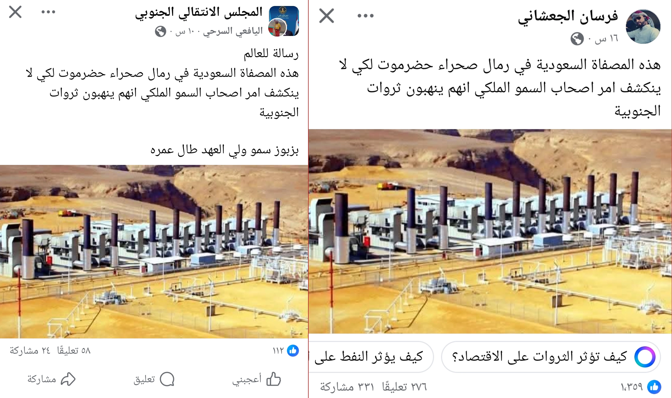 تداولت حسابات على مواقع التواصل الاجتماعي صورة لمنشأة تدّعي أنها لمصفاة السعودية في رمال صحراء حضرموت تعمل على نهب النفط الحضرمي... فما حقيقة الصورة المتداولة؟