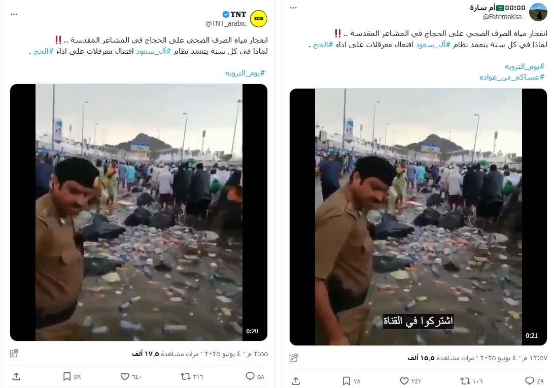 تداولت حسابات على منصة "إكس" مقطع فيديو يُزعم أنه يُظهر انفجار مياه الصرف الصحي على الحجاج في المشاعر المقدسة... فما حقيقة هذا الفيديو المتداول؟