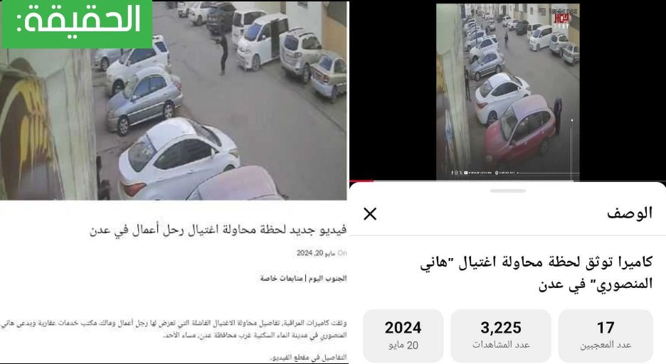 تحقق فريق منصة مُسند من الفيديو المتداول باستخدام أدوات البحث العكسي وتبيّن أن الفيديو قديم وتعود حقيقته إلى محاولة اغتيال سابقة نفذها مسلحون يعتقد أنهم موالون للمجلس الانتقالي استهدفت رجل أعمال ومالك مكتب خدمات عقارية يُدعى هاني المنصوري في مدينة إنماء السكنية غرب محافظة عدن وقد نُشر الفيديو بتاريخ 20 مايو 2024