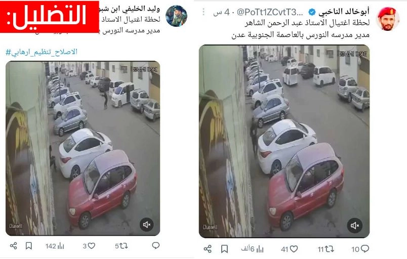 يأتي تداول الفيديو بالتزامن مع انتشار فيديو لعملية اغتيال نفذها مسلحون مجهولون اليوم في عدن استهدفت التربوي عبد الرحمن الشاعر، مدير مدرسة النورس الأهلية.