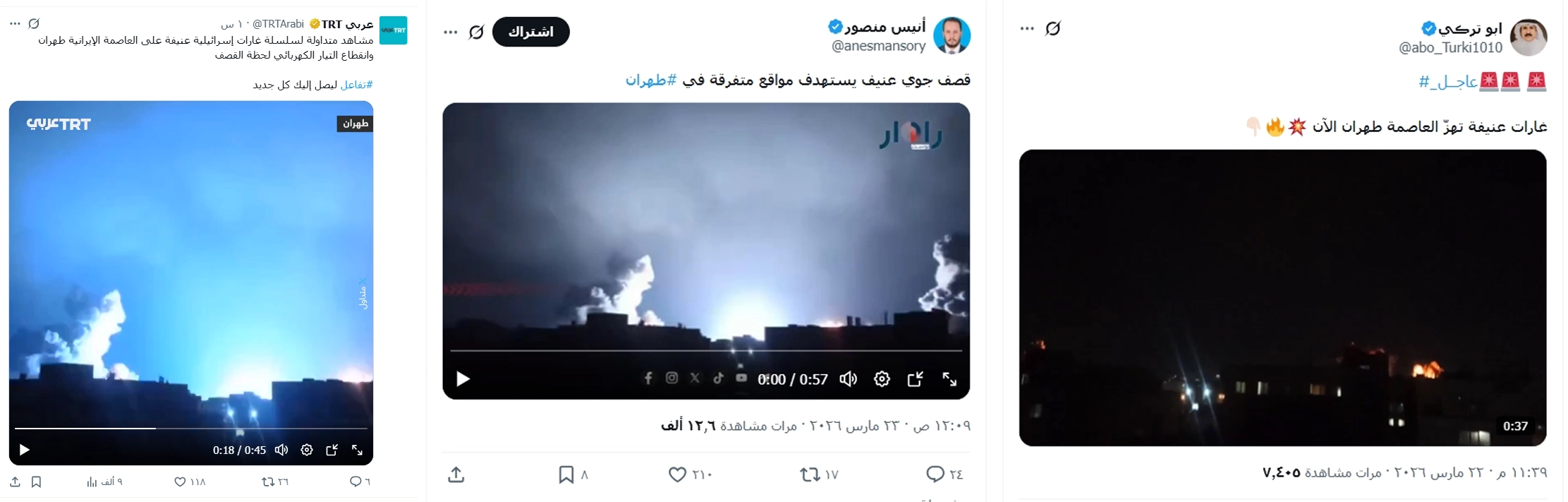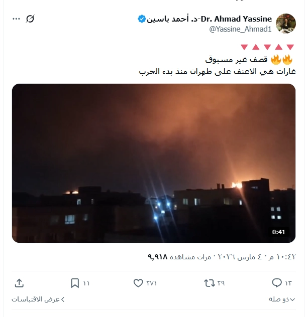 فيديو القصف على طهران يعود إلى 4 مارس، وليس لقصف اليوم كما تداولته وسائل إعلام مختلفة.