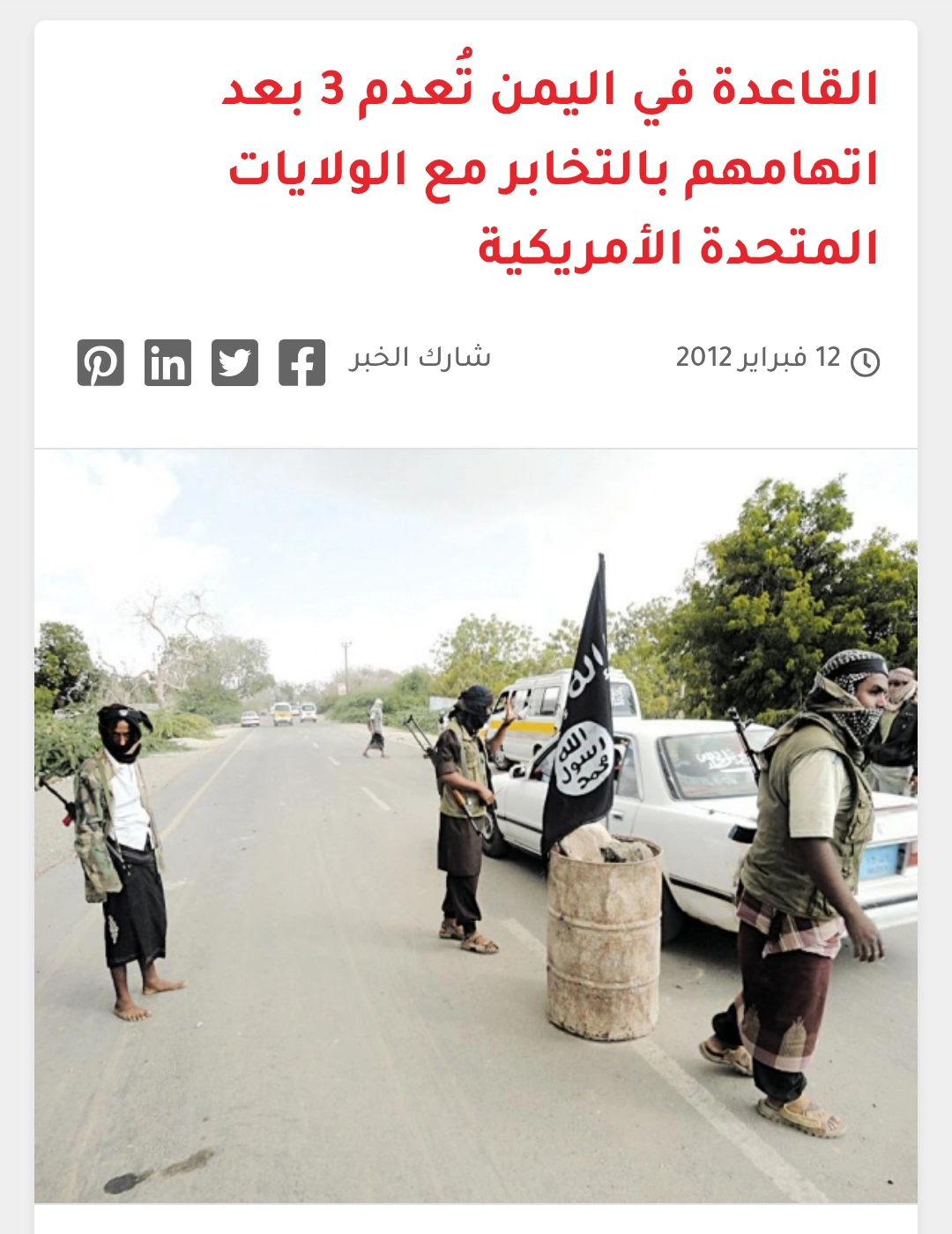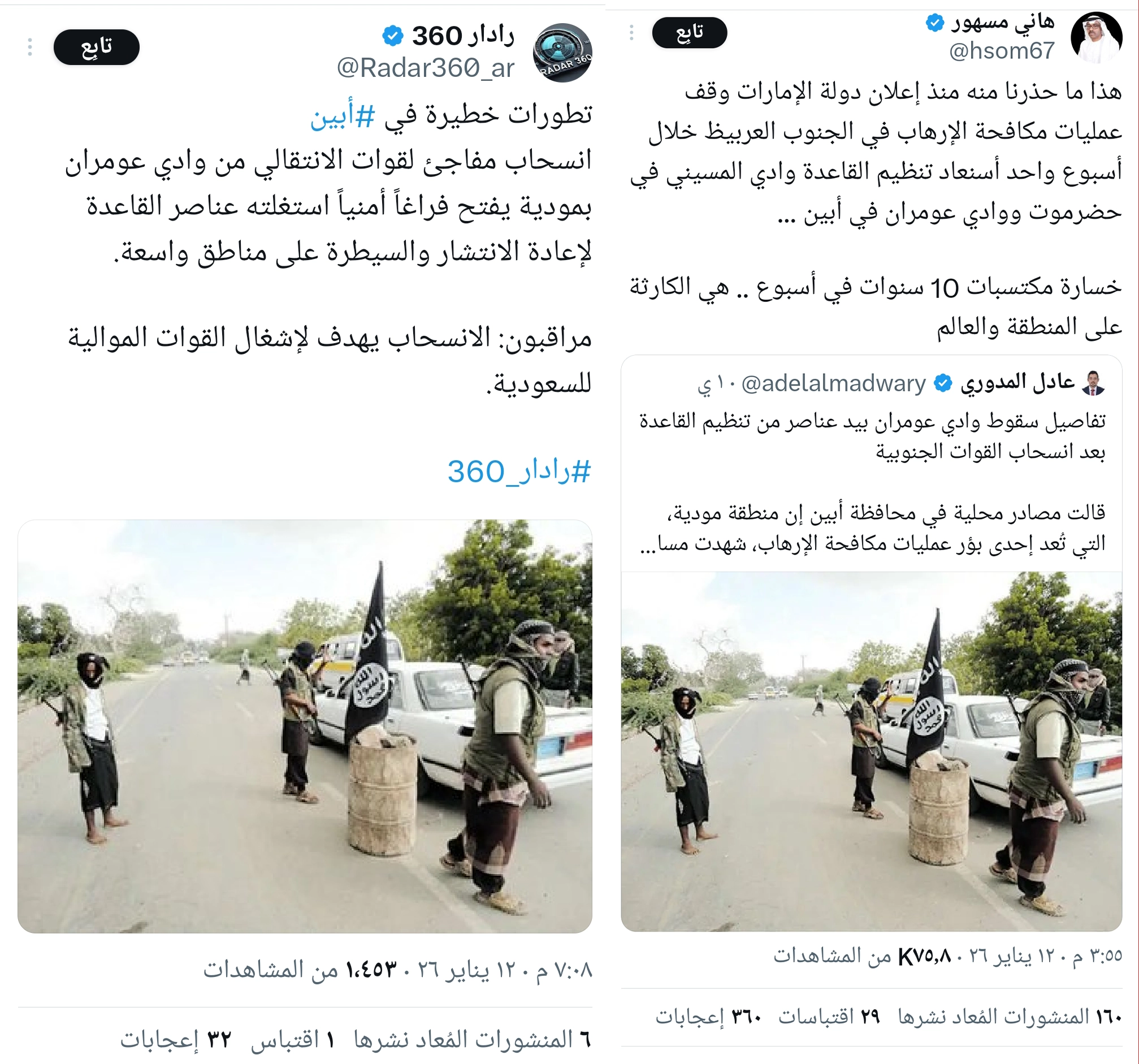 تداولت حسابات على مواقع التواصل الاجتماعي صورة لنقطة تفتيش لمسلحين، بجانبهم شعار القاعدة، على خط إسفلتي بمحافظة أبين، تُدّعي أنها حديثة بعد سيطرة التنظيم الإرهابي على مناطق في أبين عقب انسحاب جنود يتبعون الانتقالي الانفصالي المنحل... فما حقيقة الصورة المتداولة؟