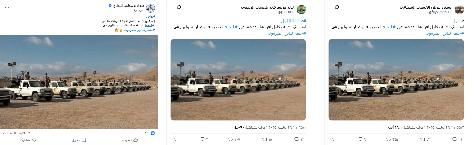 تداولت حسابات على مواقع التواصل الاجتماعي صورة تدّعي إنها لكتيبة مع كامل عتادها العسكري انشقت عن قوات النخبة الحضرمية وانضمت إلى قوات حلف قبائل حضرموت... فما حقيقة الصورة المتداولة؟