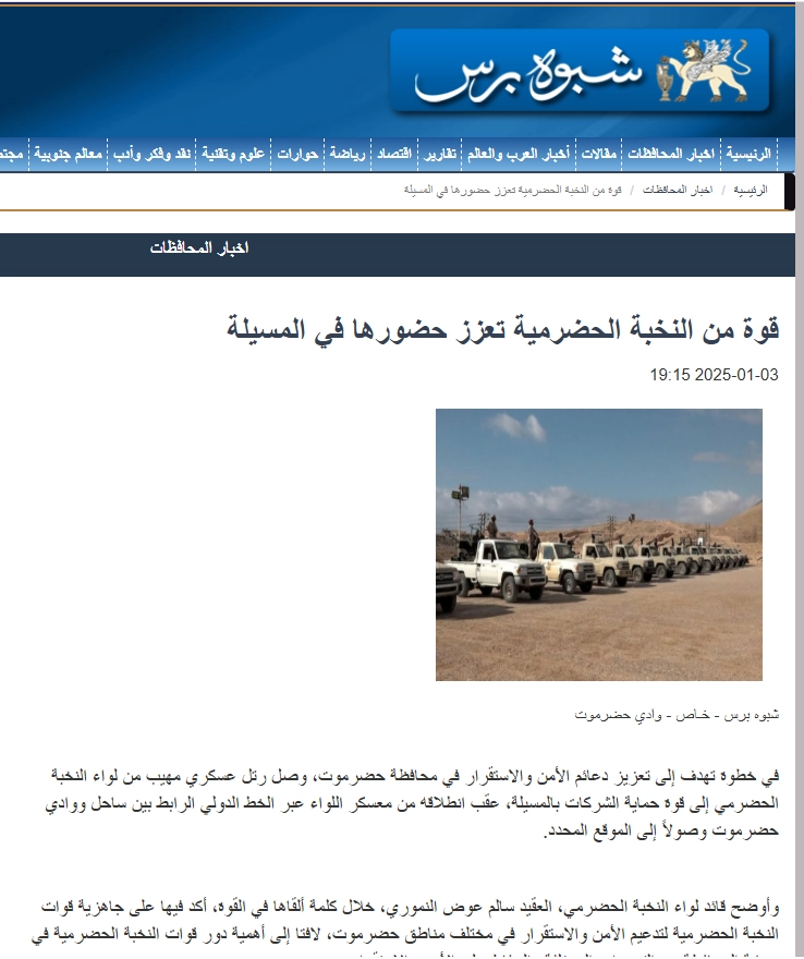 تحقّق فريق منصة مُسند من حقيقة الصورة المتداولة باستخدام أدوات البحث العكسي، وتبيّن أن الصورة قديمة ونُشرت كخبر عن قوة من النخبة الحضرمية تعزّز حضورها في المسيلة، وتعود بتاريخها إلى 2025-1-3.