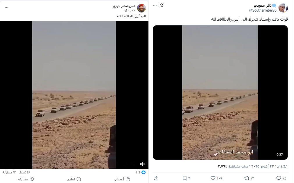 تداولت حسابات على منصات التواصل الاجتماعي مقطع فيديو زُعِم أنه يُظهر تحرّك قوات دعم وإسناد إلى محافظة أبين، فما حقيقة الفيديو المتداول؟