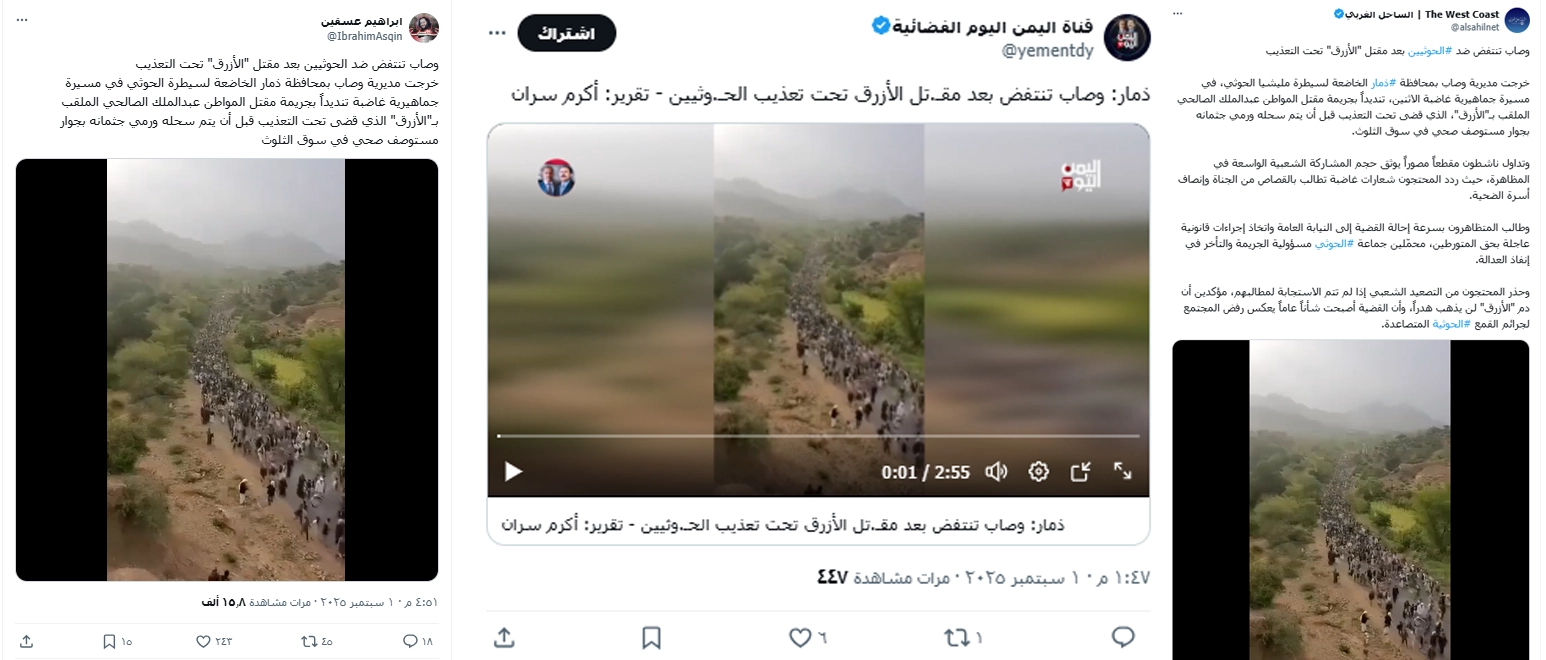 تداولت حسابات ووسائل إعلام يمنية على منصات التواصل الاجتماعي فيديو زُعِم أنه يعود لمظاهرة حاشدة في مديرية وصاب بمحافظة ذمار، تنديدًا بمقتل الأزرق الذي تعرّض للتعذيب وتم رميه في سوق "الثلوث" بالمديرية. فما حقيقة الفيديو المتداول؟
