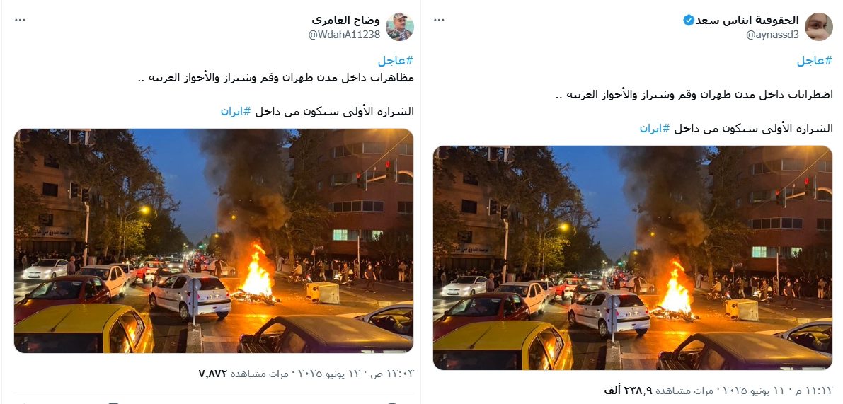 تداولت حسابات على منصة "إكس" و"فيسبوك" صورة تدّعي أنها لاضطرابات في مدن إيرانية منها طهران وقم وشيراز والأحواز العربية, ما حقيقة هذه الصورة؟