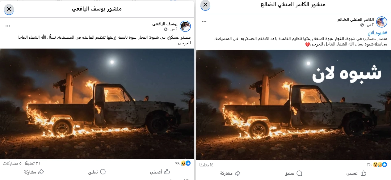 تداولت حسابات على مواقع التواصل الاجتماعي خبراً وصورةً زعمت أنها تظهر انفجار مركبة جراء زرع عبوة ناسفة من قبل تنظيم القاعدة، استُهدفت مركبة للقوات التابعة للمجلس الانتقالي الجنوبي في منطقة المصينعة بمحافظة شبوة جنوب شرق البلاد. فما حقيقة الصورة؟