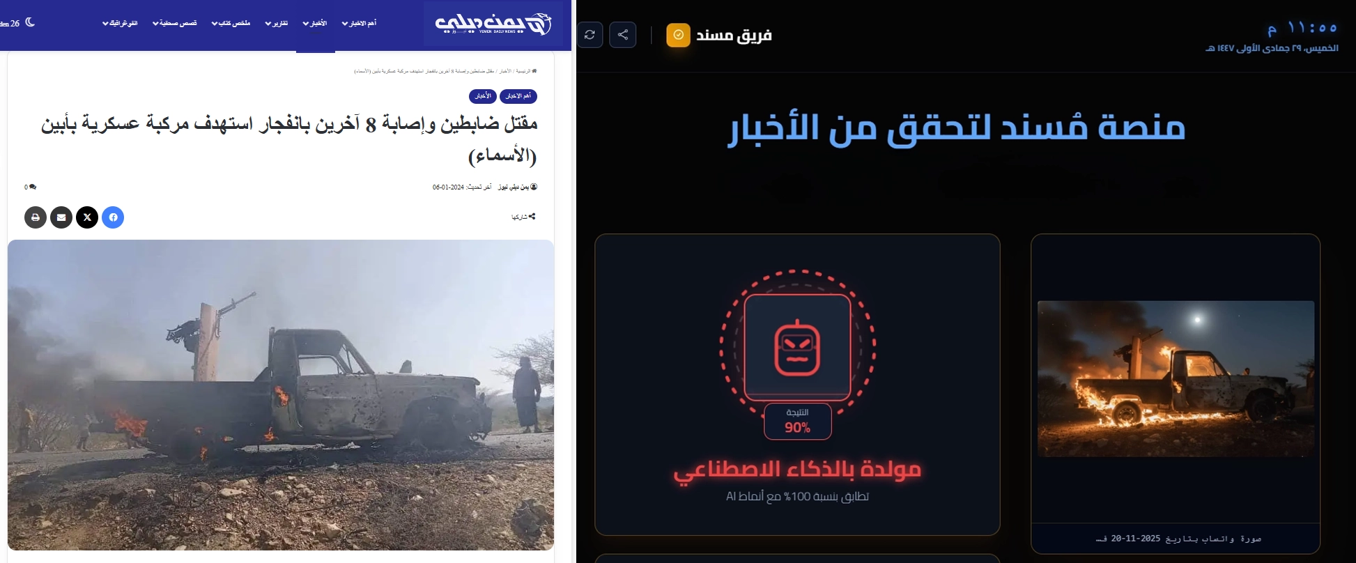 تحقّق فريق منصة مُسند من حقيقة الصورة أولًا باستخدام أدوات البحث العكسي، وتبيّن أن الصورة قديمة ونُشرت في يناير من عام 2024، وهي تعود لمواجهات أدّت إلى احتراق طقم عسكري في محافظة أبين جنوب اليمن.