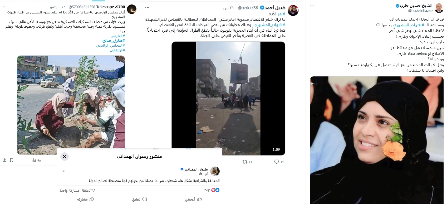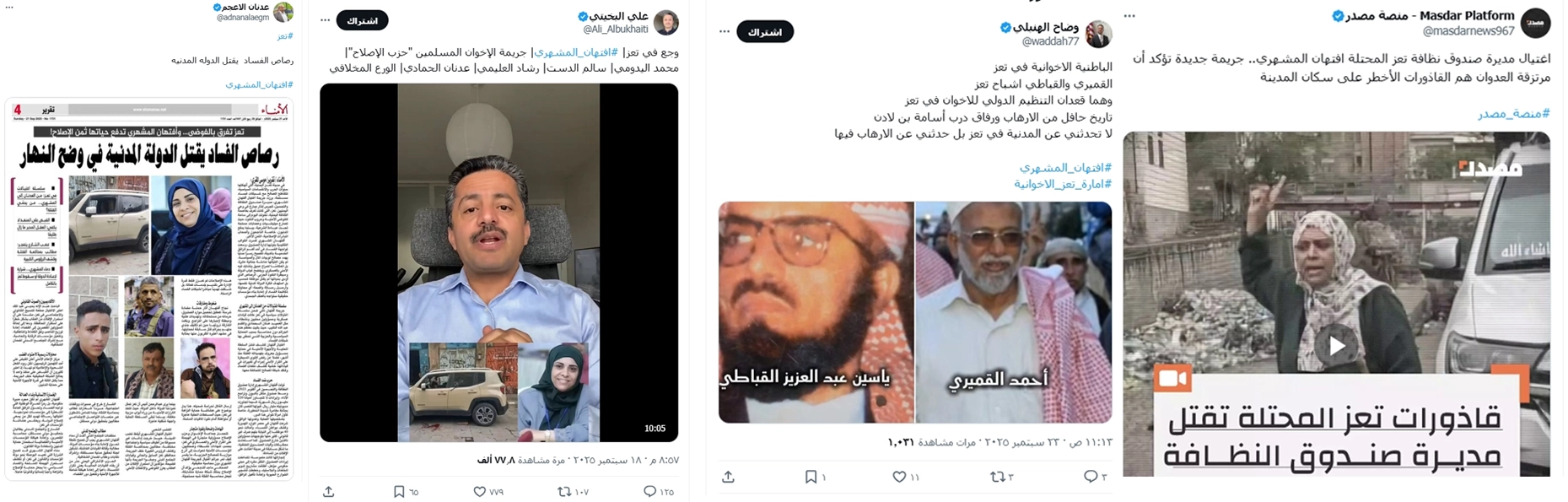 تصدر وسم #افتهان_المشهري مديرة صندوق النظافة والتحسين بمحافظة تعز منصات التواصل الاجتماعي بعد ساعات من انتشار خبر اغتيالها في 18 سبتمبر/أيلول 2025.ما إن انتشر الخبر حتى تصدّر وسم #افتهان_المشهري منصة "إكس"، ليتحوّل من مساحة تضامن إنساني ورثاء إلى حملة رقمية واسعة اتخذت مسارًا سياسيًا وتحريضيًا غير واسع.