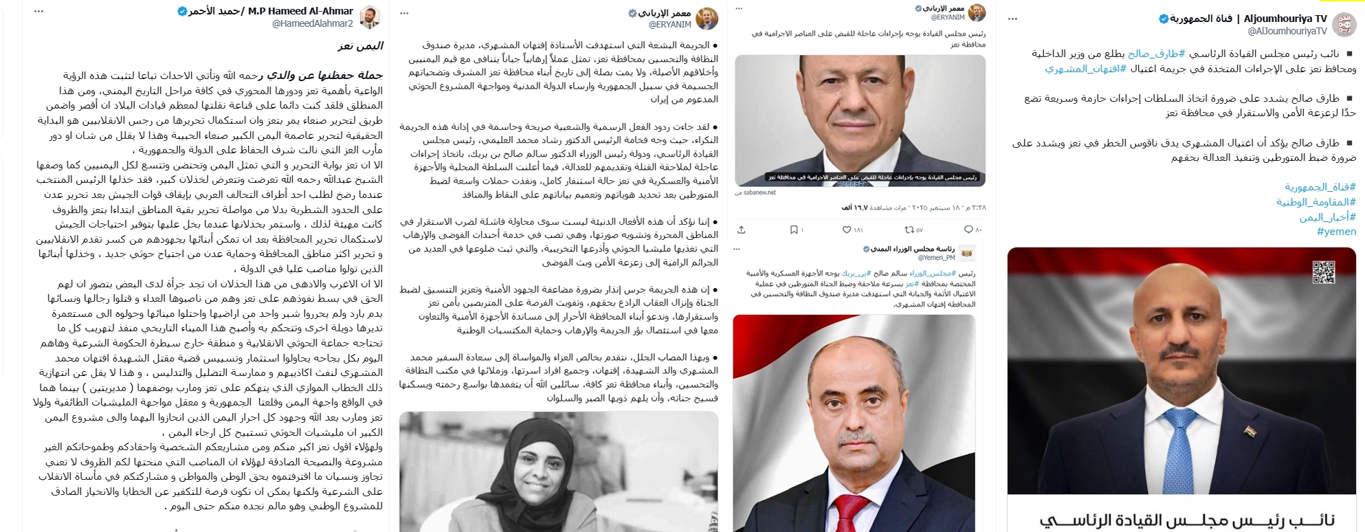 لم يقتصر وسم #افتهان_المشهري على التعبير عن الغضب الشعبي أو المطالبات بالعدالة، بل تحوّل سريعًا إلى أداة للاستقطاب السياسي. فقد وظّفت جماعة الحوثي الحادثة عبر شخصيات مثل محمد الفرح وحسين حازب، للترويج لروايتها عن "فشل المناطق المحررة"، مع التركيز على تصوير تعز كمسرح للفوضى الأمنية والانقسام. وفي المقابل، دفعت حسابات مرتبطة بـ المجلس الانتقالي الجنوبي بوسم مضاد هو #تعزمعقل_الإرهاب، محوّلة النقاش من جريمة جنائية إلى منصة لتشويه المدينة بأكملها وتقديمها كـ"بؤرة للعنف". أما محور طارق صالح، فقد تبنّى خطابًا يهاجم حزب الإصلاح بشكل مباشر، وهو ما ظهر في منشورات لشخصيات مثل علي البخيتي وأحمد الشرعبي التي استخدمت مصطلحات مثل "الإصلاح الإخواني" و"تعز معقل الإرهاب". هذا الخطاب انسجم مع تصريحات طارق صالح نفسه، الذي وصف الجريمة بأنها "ناقوس خطر"، في رسالة قرأها مراقبون كجزء من سردية أوسع تسعى لإعادة تشكيل إدارة تعز بقيادة محوره السياسي والعسكري.