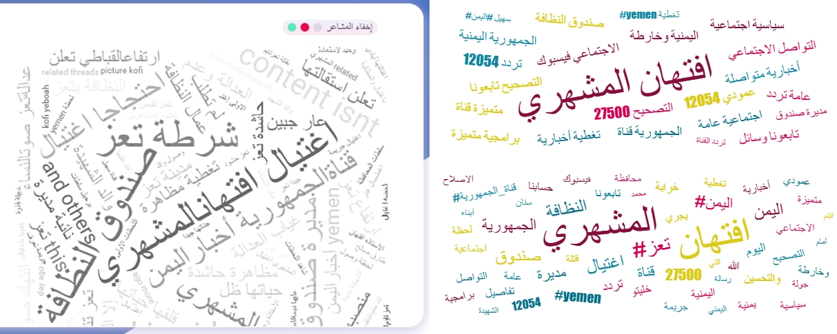 كما تكشف السحابة أن اسم المشهري ارتبط بشكل مباشر بعبارات مثل "اغتيال" و"النظافة" و"صندوق التحسين"، بما يعكس ربط الحدث بسياقه الوظيفي والإداري. في حين حضرت كلمات مثل "اليمن" و"تعز" و"الجمهورية" ضمن محاولات لتوسيع نطاق النقاش من جريمة محلية إلى ملف وطني ذي دلالات سياسية.