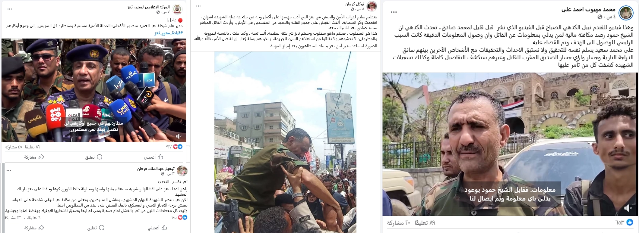 وقد تضاعف أثر التضليل عندما نشر الناطق باسم شرطة تعز، أسامة الشرعبي، عبر صفحته الشخصية، منشورات اتهم فيها شخصيات قبلية وقيادات عسكرية بعرقلة التحقيق، وهي تصريحات قُرئت في البداية كموقف رسمي ثم أعيد تداولها على نطاق واسع، قبل أن تنفي الأجهزة الأمنية صحتها في بيانها وتصفها بأنها مجرد "مناكفات" لا تمت إلى الموقف المؤسسي بصلة. هذا التناقض عزّز مناخ الارتباك وأفقد الخطاب الأمني الرسمي مصداقيته، بينما استغلته الحملات الرقمية لإعادة إنتاج شكوك واتهامات غذّت حالة الغضب والانقسام.