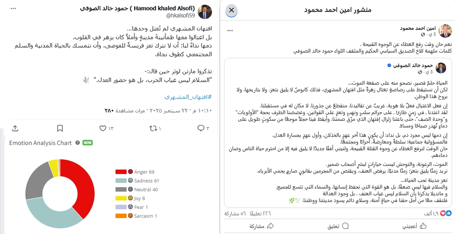 لم يدم الطابع التضامني طويلًا، فخلال 24 ساعة فقط من جريمة اغتيال افتهان المشهري، تغيّر مسار وسم #افتهان_المشهري من مساحة للرثاء الإنساني والتضامن إلى ساحة مشحونة بالاتهامات السياسية الحادة. وبحلول 21 سبتمبر، أصبحت المنشورات ذات الطابع السلبي تمثل ما يقارب 80% من إجمالي المحتوى، مقابل 12% فقط إيجابية، بعد أن انتقل الخطاب من عبارات التعاطف والمواساة إلى تحميل أطراف سياسية وأمنية مسؤولية مباشرة عن الحادثة. هذا التحول لم يكن عفويًا بالكامل، إذ أظهر تحليل رقمي أن نحو 55% من المنشورات المؤثرة جاءت من حسابات خارج اليمن، ما ساهم في تضخيم الروايات وربطها بسياق الصراع السياسي القائم. هذه النسبة المرتفعة كان لها أثر واضح في دفع النقاش من مطالبات بتحقيق جنائي إلى حملة سياسية مكثفة تجاوزت حدود القضية الإنسانية.