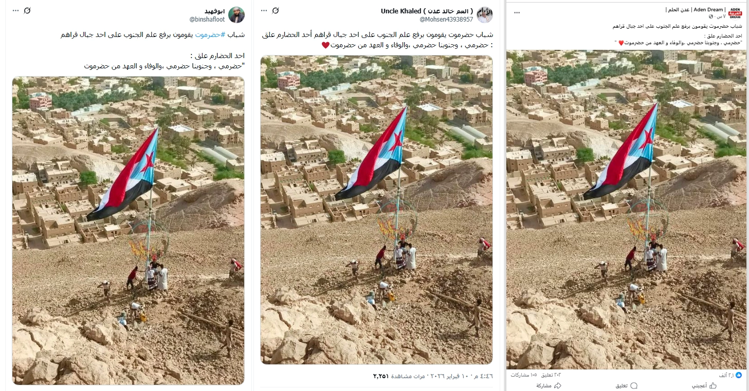 تداولت حسابات على مواقع التواصل الاجتماعي صورة لعلم الانفصال، تدّعي أنها راية رُفعت حديثًا ضمن تظاهرات مناصري الانتقالي المنحل في محافظة حضرموت شرق اليمن. فما حقيقة الصورة المتداولة؟