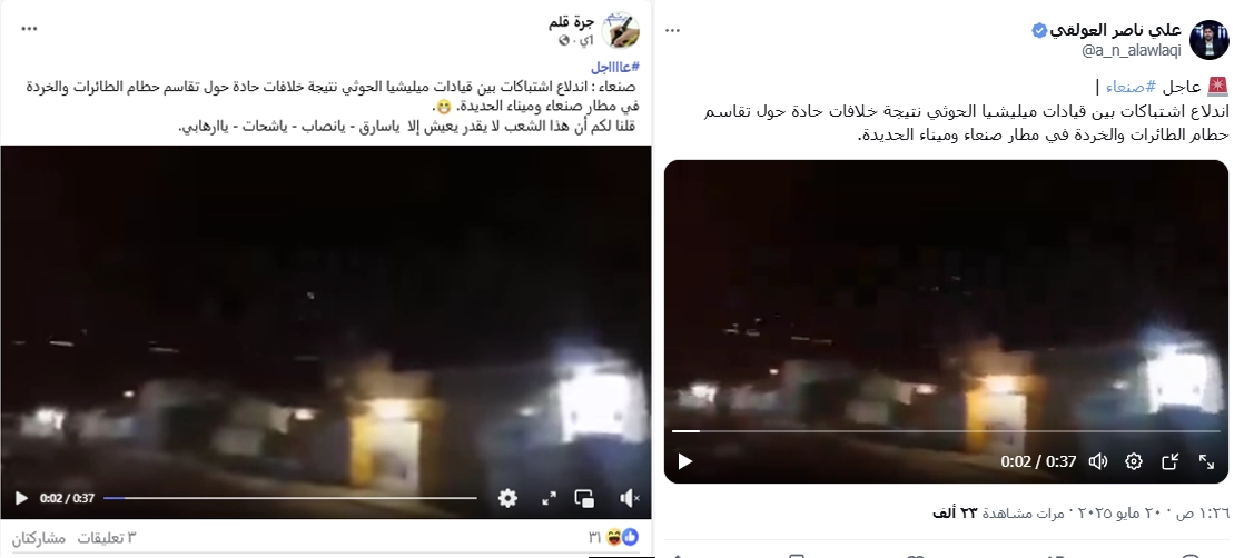تداولت حسابات على منصات التواصل الاجتماعي ومواقع إخبارية فيديو تدّعي أنه يوثق اندلاع اشتباكات بين قيادات لجماعة الحوثي في صنعاء نتيجة خلافات حادة حول تقاسم حطام الطائرات التي تعرضت لقصف من قبل الطيران الإسرائيلي قبل أيام في مطار صنعاء، ومخلفات حديد في ميناء الحديدة الناتجة عن القصف الإسرائيلي أيضًا... فما حقيقة الفيديو المنتشر؟