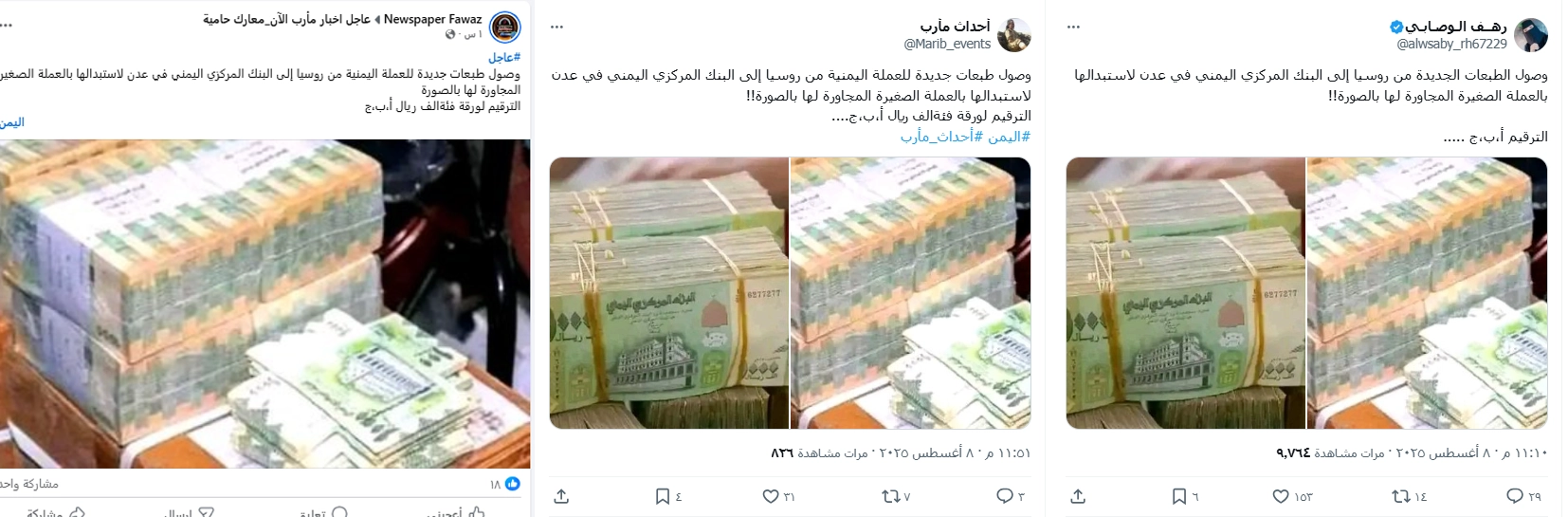 تداولت حسابات على مواقع التواصل الاجتماعي صورة زُعم أنها لِوصول طبعات جديدة من العملة اليمنية من روسيا إلى البنك المركزي اليمني في عدن، لاستبدالها بالعملة الصغيرة المرافقة لها في الصورة , فما حقيقة هذه الصورة؟