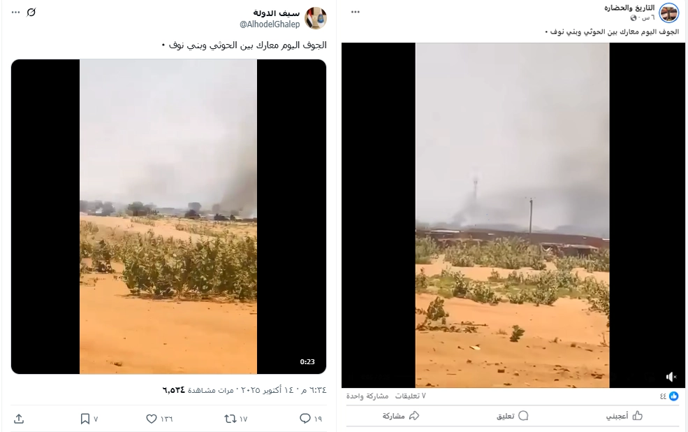 تداولت حسابات على منصات التواصل الاجتماعي مقطع فيديو يُزعم أنه يُظهر اشتباكات مسلّحة دارت اليوم في محافظة الجوف بين مسلّحين من قبائل بني نواف وجماعة الحوثي. فما حقيقة الفيديو المتداول؟