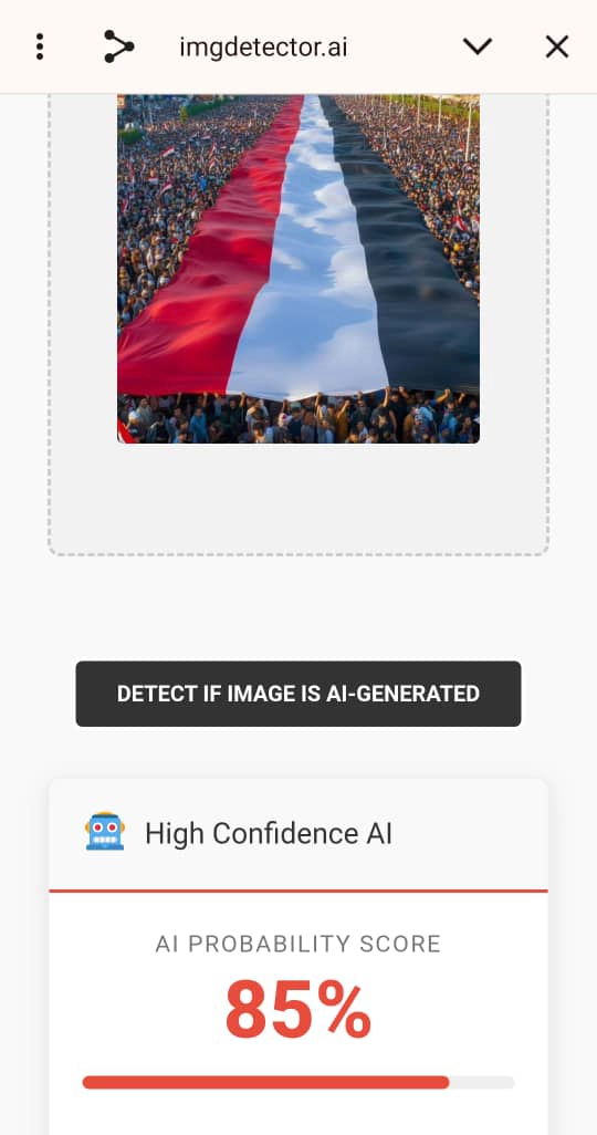 تحقق فريق منصة مُسند من الصورة المتداولة باستخدام أدوات كشف التزييف العميق، وفحص تدخلات الذكاء الاصطناعي في إنشاء الصورة، وتبيّن أن الصورة مولدة بالذكاء الاصطناعي بنسبة 85%.