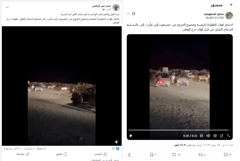 تداولت حسابات على مواقع التواصل الاجتماعي فيديو لقوات عسكرية كبيرة، تدّعي أنه لاحتجاز قوات الطوارئ اليمنية ومنعها من الخروج إلا بعد تسليم سلاحها من حضرموت بعد استكمال مهامها فما حقيقة الفيديو المتداول؟