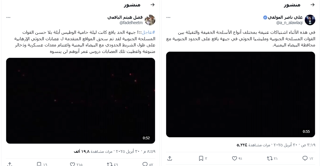 تداولت حسابات على منصة "إكس" مقطع فيديو تدعي إنه تم تصويره في جبهة الحد – يافع، إثر اشتباكات دارت بين القوات التابعة للحكومة في محافظة الضالع وبين جماعة الحوثي فما حقيقة الفيديو المتداول؟