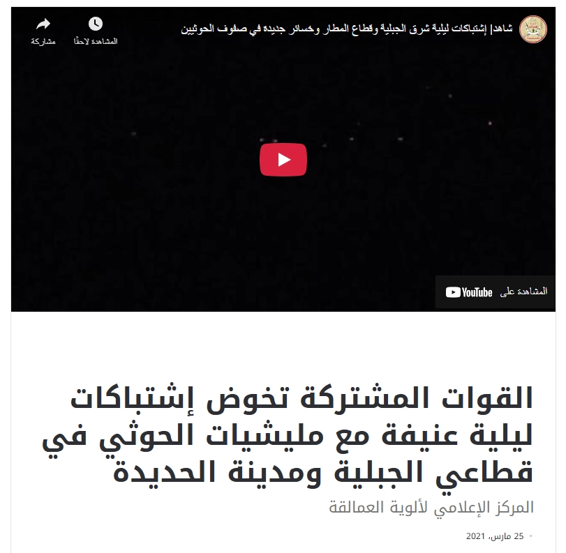 المقطع قديم ويعود إلى اشتباكات بين القوات المشتركة وجماعة الحوثي في قطاعي الجبلية ومدينة الحديدة غرب اليمن ، بتاريخ 25 مارس 2021. وليس لاشتباكات في الحد بيافع