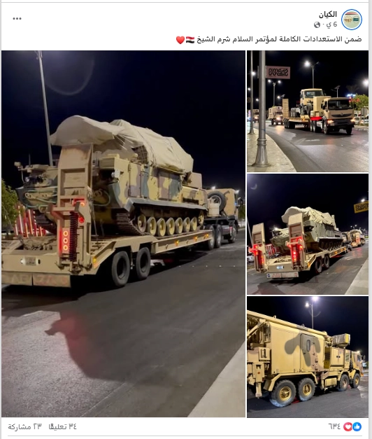 الصور المتداولة للمعدات العسكرية لا تُظهر دعمًا لوجستيًا لمأرب، بل توثّق انتشار القوات المصرية لتأمين قمة السلام في شرم الشيخ 2025