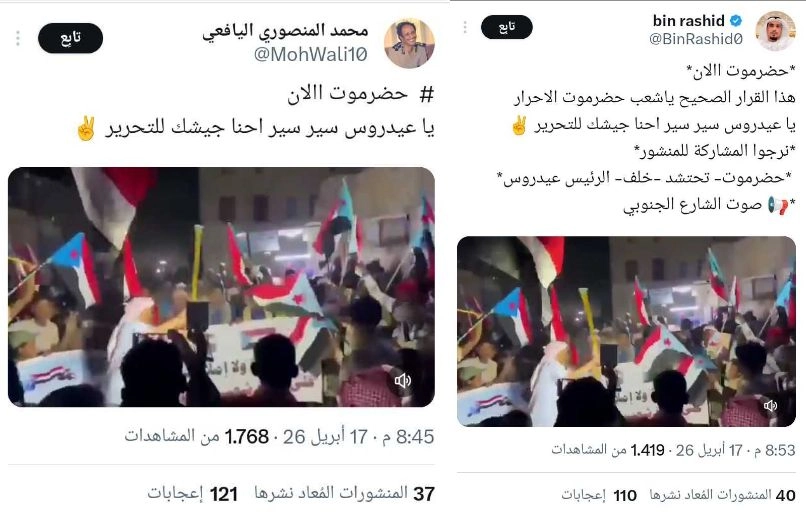 يأتي تداول هذا المحتوى في ظل دعوات متجددة خلال الـ48 ساعة الماضية أطلقتها حسابات تابعة للمجلس الانتقالي الجنوبي المنحل للخروج في مظاهرات بمحافظة حضرموت لمناصرة الانتقالي المنحل ومساندة رئيس المجلس عيدروس الزبيدي، الملاحق قانونيًا من قبل القضاء اليمني بتهم الخيانة