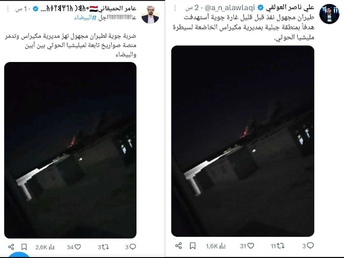تداولت حسابات على مواقع التواصل الاجتماعي صورة يُزعم أنها تُظهر غارة جوية حديثة نفذها طيران مجهول استهدفت منطقة جبلية في مديرية مكيراس الخاضعة لسيطرة جماعة الحوثي. فما حقيقة هذه الصور المتداولة؟