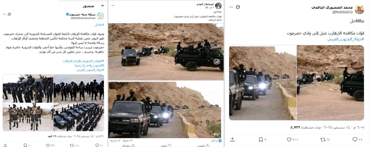 تداولت حسابات على مواقع التواصل الاجتماعي صورًا تظهر جنودًا يرتدون ملابس عسكرية باللون الأسود ومركبات تحمل عددًا منهم؛ تدّعي أنها توثّق قوات مكافحة الإرهاب بعد وصولها إلى وادي حضرموت، الذي سيطر عليه مسلحو المجلس الانتقالي قبل أيام. فما حقيقة الصور؟