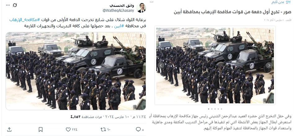 تحقّق فريق منصة مسند من حقيقة الصور بفحصها باستخدام أدوات البحث العكسي، وتبيّن أن الصور نُشرت في الأصل بتاريخ0 1 مارس 2024، وكانت مصاحبة لخبر تخرّج أول دفعة من قوات مكافحة الإرهاب بمحافظة أبين، جنوب البلاد.