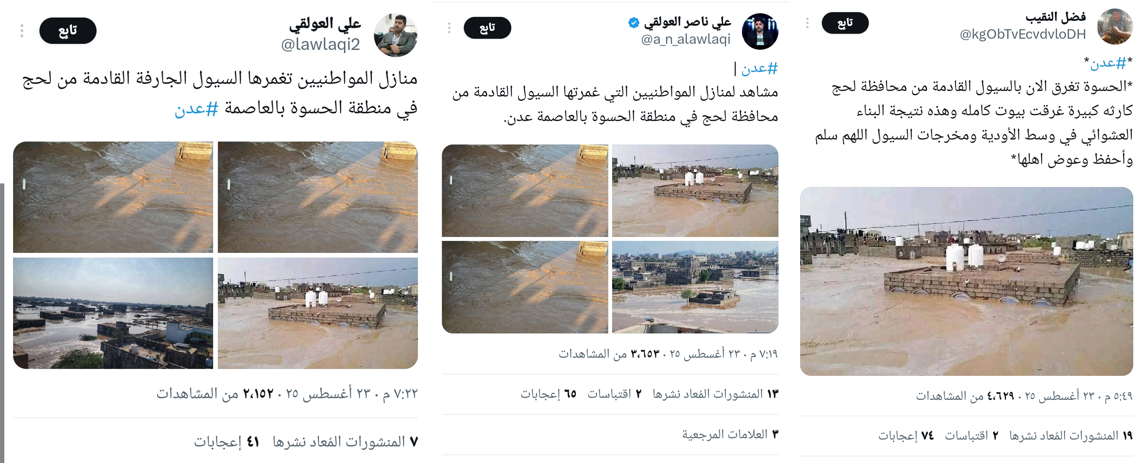 تداولت حسابات على منصات التواصل الاجتماعي صورة تدّعي أنها تُظهر غرق المنازل في منطقة الحسوة جراء السيول القادمة من محافظة لحج بالأمس. فما حقيقة الصورة المتداولة؟