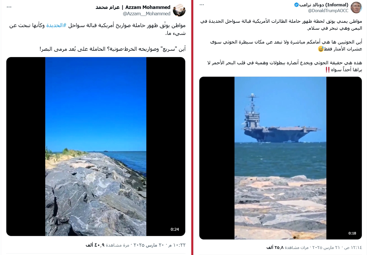تداولت حسابات يمنية على منصة "إكس" مقطع فيديو يزعم ناشره أنه لمواطن يوثّق ظهور حاملة صواريخ أمريكية قرب سواحل الحديدة اليوم .ما حقيقة المقطع المتداول؟