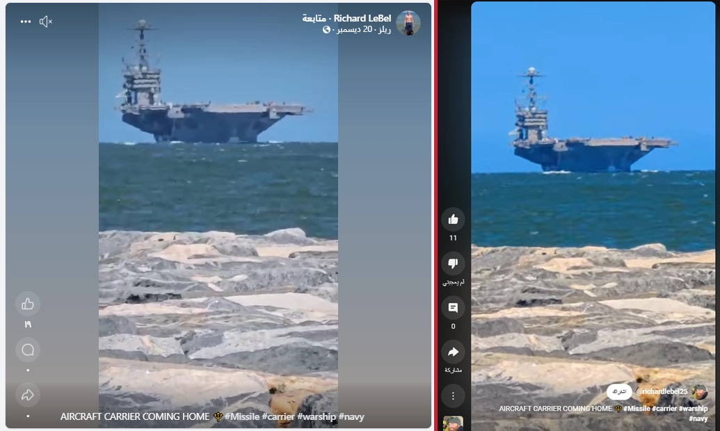 وليس في سواحل الحديدة,وتم نشر المقطع في قناة يوتيوب وفيس بوك ويعود ملكية المقطع لـ ريتشارد ليبيل ضابط سابق في البحرية الأمريكية , بعنوان: حاملة الطائرات تعود إلى الوطن