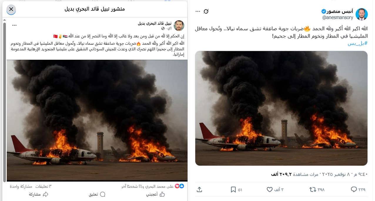 تداولت الصورة بالتزامن مع أنباء عن تنفيذ الجيش السوداني هجمات على مواقع تابعة لقوات الدعم السريع، قيل إنها استهدفت مخازن أسلحة وذخائر وطائرات مسيّرة داخل مطار نيالا وفي المناطق المحيطة به، ما أسهم في دفع الصورة للانتشار باعتبارها توثيقًا مزعومًا للهجوم.