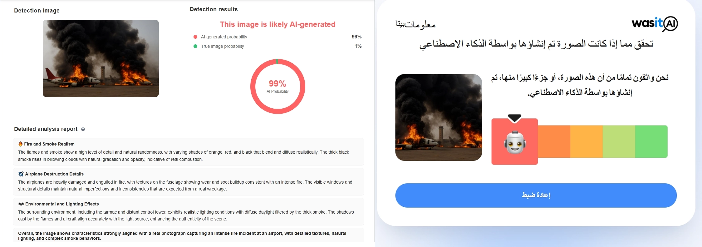 تحقّق فريق منصة مُسند من الصورة المتداولة باستخدام أدوات تحليل تكشف المؤثرات الناتجة عن التوليد بالذكاء الاصطناعي، وتبيّن أن الصورة مولَّدة بالكامل بتقنيات الذكاء الاصطناعي. كما أظهر الفحص أن أرضية المطار سليمة دون أي آثار شظايا أو علامات قصف، فيما بدت العناصر داخل المشهد ثابتة وغير منطقية مقارنة بأي واقعة انفجار حقيقية