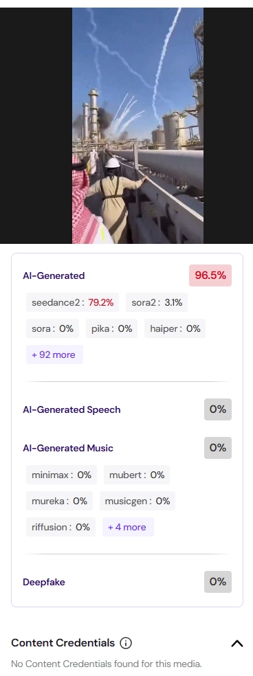 تحقق فريق منصة مُسند من الفيديو المتداول باستخدام أدوات التزييف العميق، وتبيّن أن المقطع المتداول مُولَّد بالذكاء الاصطناعي بنسبة 96%. كما أظهرت لقطات فحص الفيديو أن الصواريخ انطلقت من داخل المنشأة أثناء الانفجار، ويُعدّ هذا المشهد دليلًا على الفبركة، حيث يُظهر انطلاق الصواريخ من داخل المنشأة النفطية بالتزامن مع لحظة الانفجار، وهو ما يتعارض مع المنطق الفيزيائي لتسلسل الأحداث، ويعزز الشكوك حول التلاعب بالمحتوى أو استخدام تقنيات توليد رقمية.