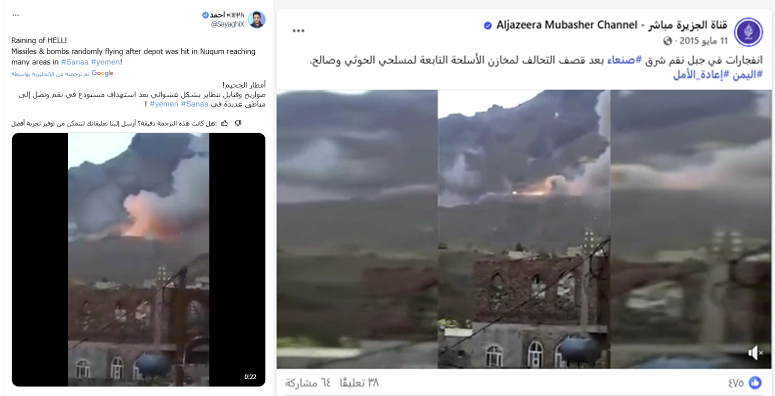 قام فريق منصة مُسند بالتحقق من صحة الفيديو المتداول باستخدام ادوات البحث العكسي ، وتبين أن الفيديو يعود الى تاريخ 11/5/2015 ويوثق انفجارات ناتجة عن قصف طيران التحالف العربي بقيادة السعودية مخزن أسلحة في منطقة نقم بالعاصمة صنعاء والذي كان المخزن قد خضع لسيطرة الحوثيين حينها .