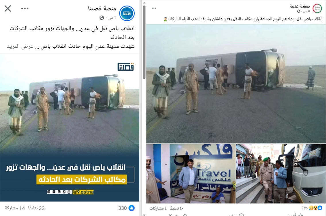 يأتي تداول الصور في ظل حادثة اشتعال حافلة في أبين قبل أيام، والتي أسفرت عن وقوع قتلى ومصابين، ما دفع عددًا من الحسابات إلى مواصلة التفاعل على المنصات ودفع الترند عبر الزعم بوقوع “انقلاب باصات ” بشكل متكرر، رغم عدم ارتباط الصور المتداولة بالحادثة الأخيرة.