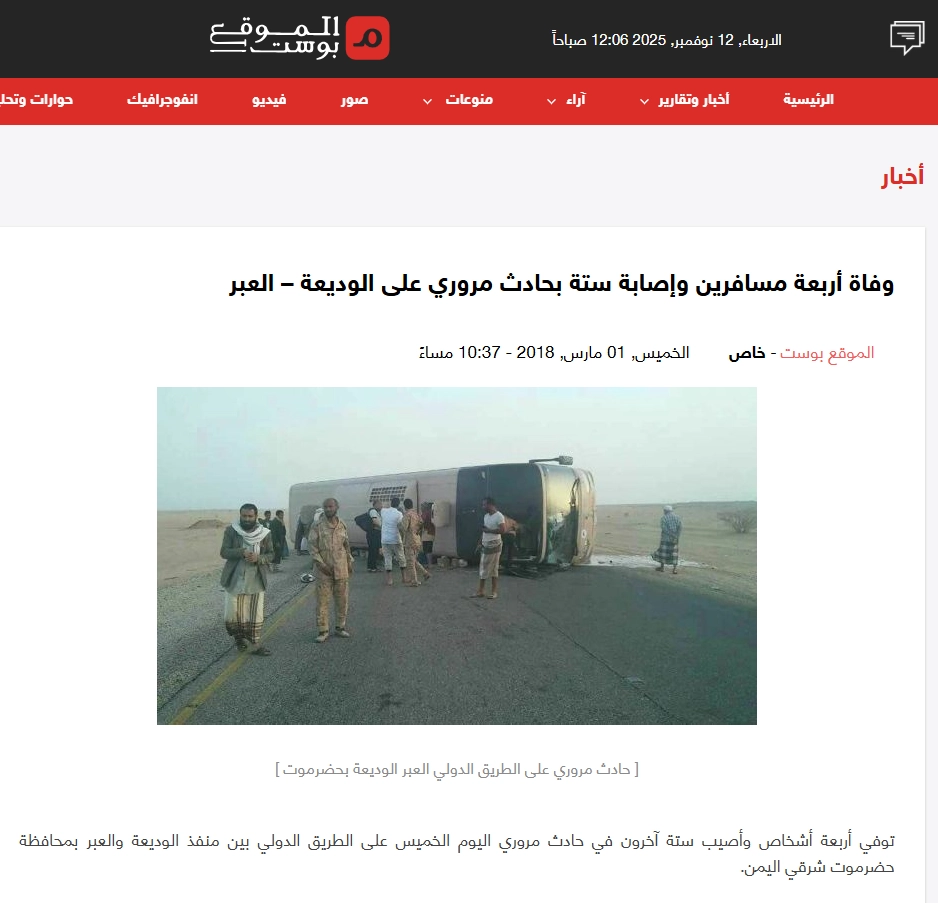 حادث وقع في شهر مارس 2018 على الطريق الرابط بين الوديعة والعبر، وأسفر حينها عن