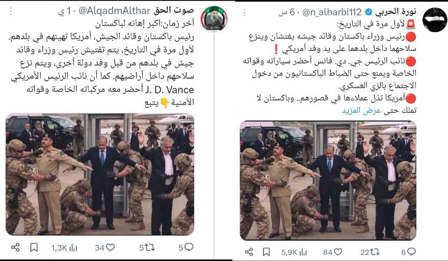 تداولت حسابات على مواقع التواصل الاجتماعي صورة تدّعي أنها تُظهر رئيس وزراء باكستان وقائد جيشه يتعرضان للتفتيش من قبل جنود أمريكيين داخل بلدهما أثناء إقامة مشاورات أمريكية إيرانية بوساطة باكستانية في باكستان... فما حقيقة هذه الصور المتداولة؟