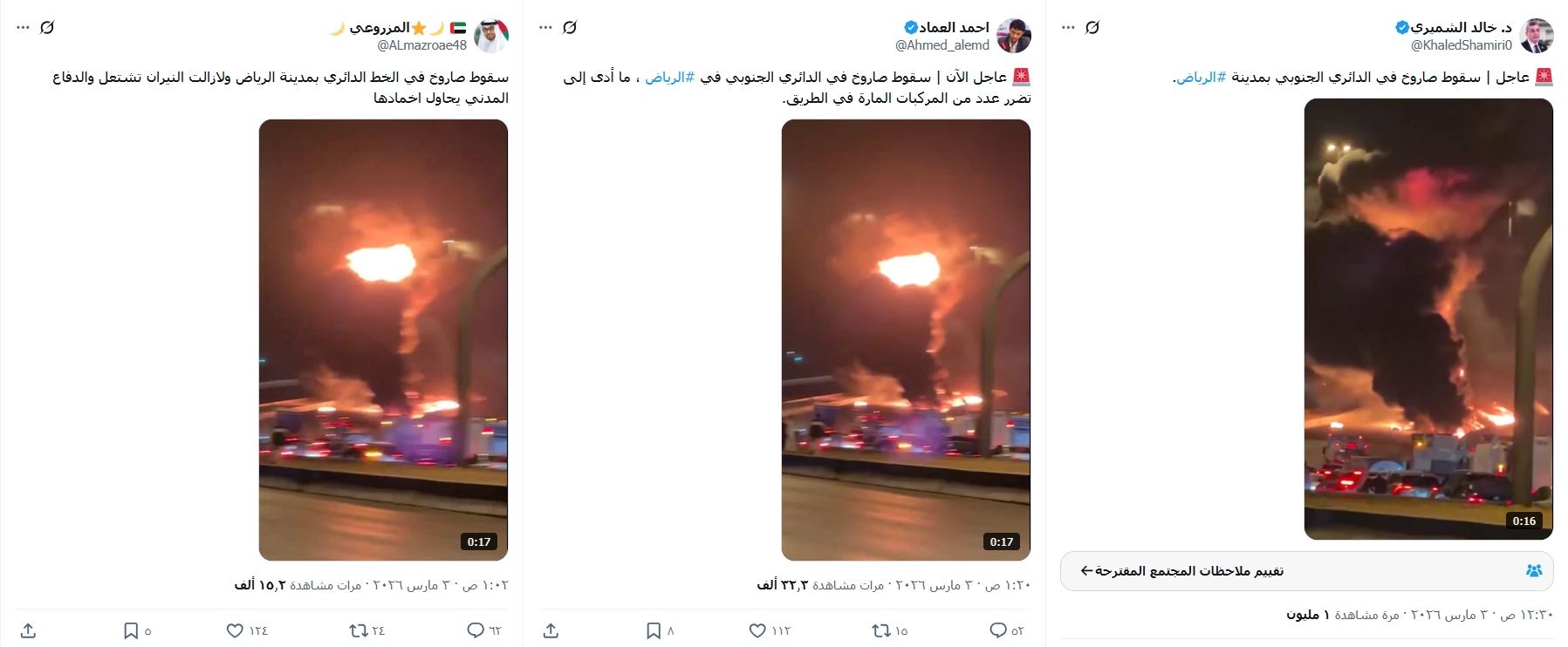 تداولت حسابات على منصات التواصل الاجتماعي فيديو تدّعي أنه لسقوط صاروخ في الدائري الجنوبي في العاصمة السعودية الرياض... فما حقيقة الفيديو المتداول؟