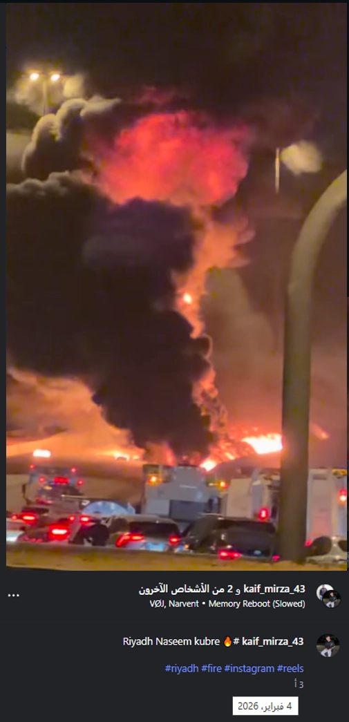 تحقق فريق منصة «مُسند» من الفيديو المتداول باستخدام أدوات البحث العكسي، وتبيّن أن الفيديو قديم، إذ يعود لحريق في منطقة الخبر بحي النسيم في مدينة الرياض، وكان قد نُشر بتاريخ 4 فبراير 2026، وليس حديثًا ولا يعود لسقوط صاروخ مستهدفًا الرياض ناتجًا عن الأحداث الدولية الجارية.