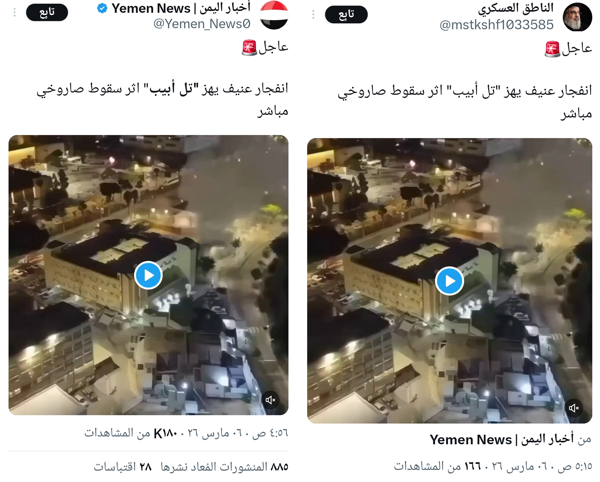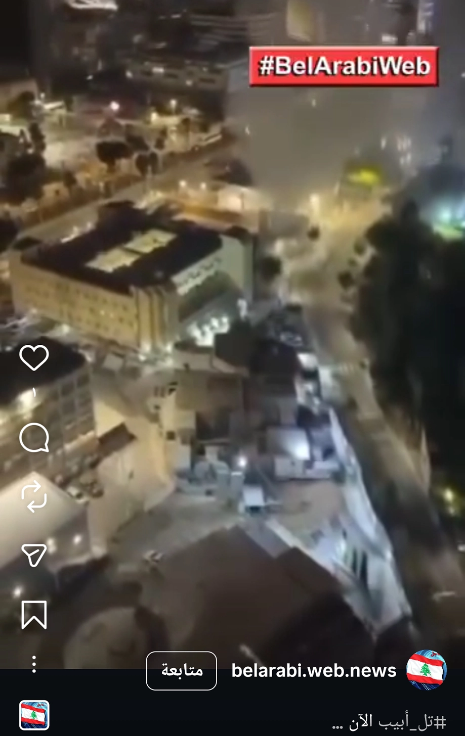 تداولت حسابات على مواقع التواصل الاجتماعي فيديو تدّعي أنه يوثق انفجارات حديثة وقعت في تل أبيب إثر سقوط صاروخ ناتج عن القصف المتبادل حديثًا بين إيران وإسرائيل وحزب الله..