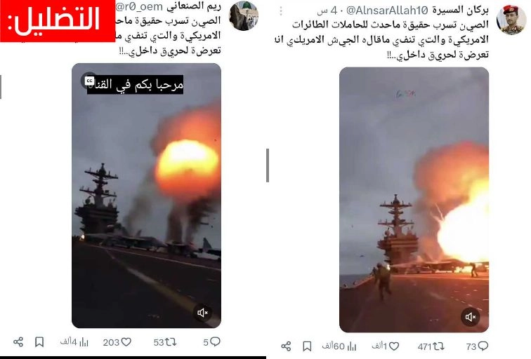 تداولت حسابات على مواقع التواصل الاجتماعي مقطع فيديو زُعم أنه يكشف تسريبًا صينيًا حول تعرض حاملات طائرات أمريكية لحريق، فما حقيقة هذا الفيديو المتداول؟