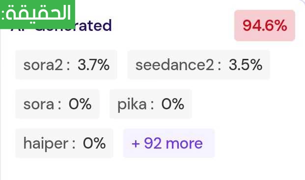 تحقق فريق منصة مُسند من الفيديو المتداول باستخدام أدوات كشف التزييف العميق والتحقق من المحتوى المُولّد، وتبيّن أن الفيديو مُولّد بالذكاء الاصطناعي بنسبة 94.6%، حيث يحتوي المشهد على تفاصيل وانفجارات غير طبيعية