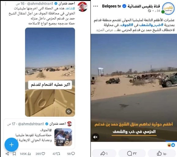 تداولت حسابات على مواقع التواصل الاجتماعي مقطع فيديو يزعم ناشروه أنه يوثق اقتحام عشرات الأطقم الحوثية المدججة بالمسلحين لمنطقة فدغم في مديرية خب والشعف بمحافظة الجوف، لاختطاف الشيخ حمد بن فدغم الحزمي من منزله فما حقيقته؟