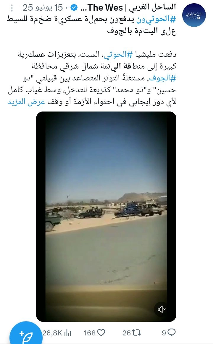 يأتي تداول هذا الفيديو في ظل التوترات والخلافات التي شهدتها محافظة الجوف خلال الأيام الماضية بالتزامن مع تحركات وتصعيد ميداني مرتبط بجماعة الحوثي في المنطقة